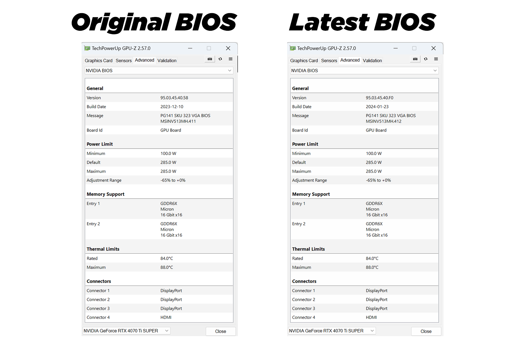 For absolute clarity then, the numbers presented below are comparing the MSI RTX 4070 Ti Super Ventus 3X's original BIOS, version 95.03.45.40.58, with the latest version 95.03.45.40.F0 (which is the one MSI has made publicly available HERE). Despite the updates, it's interesting that the card's rated clock speed was never tweaked from 2610MHz boost, nor was the power limit adjusted from its default value of 285W. Neither Nvidia or MSI have specified what the issue was, or what has changed, so there's only one thing left to do…