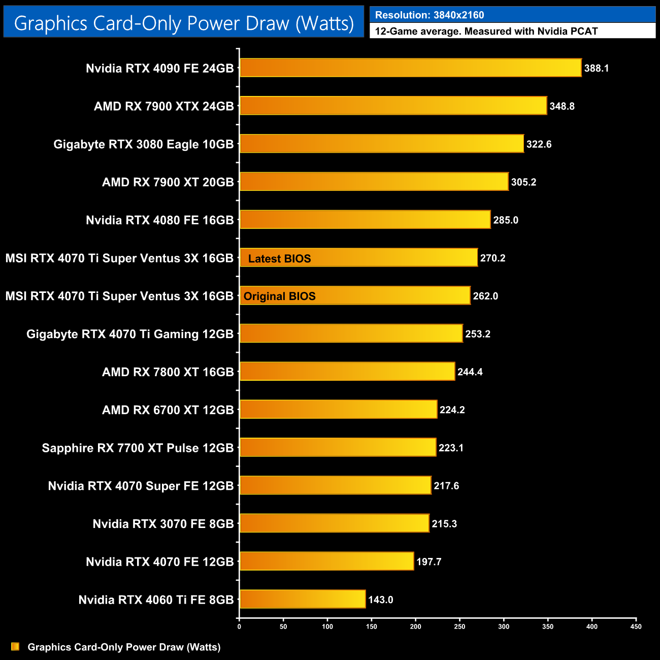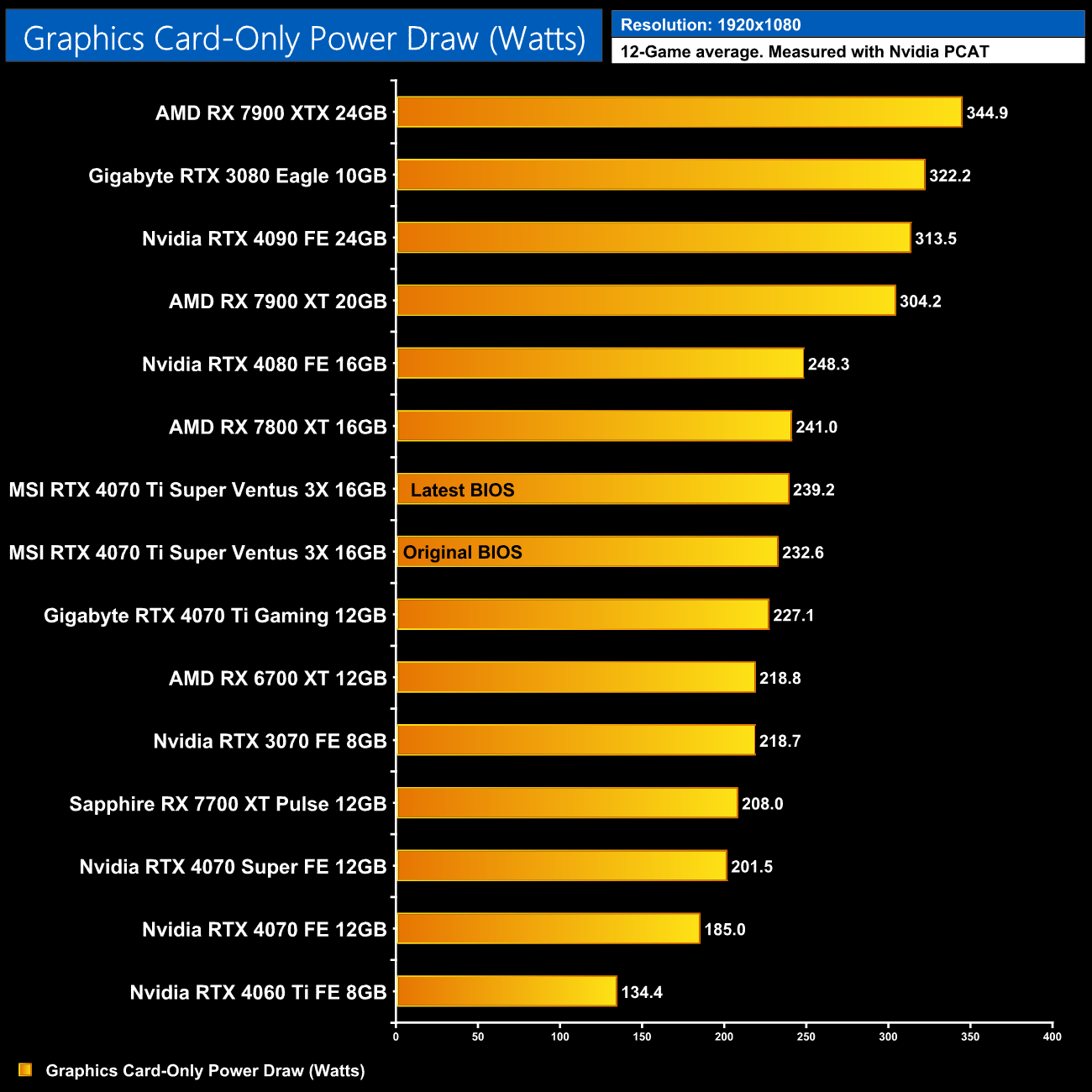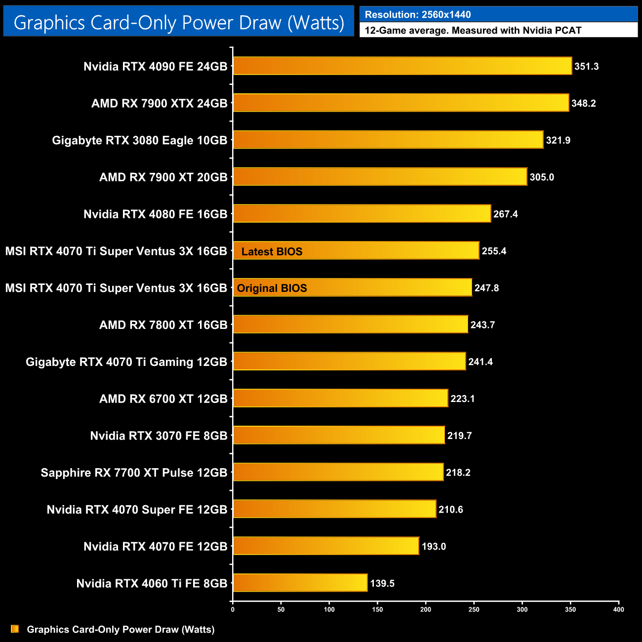 I also logged power draw of the graphics card-only, using Nvidia's PCAT tool, over every single game we tested – this is standard practice in our reviews as it allows us an excellent insight into power draw and efficiency on a per-game, per-resolution basis (you can read more about how and why we do this HERE.)