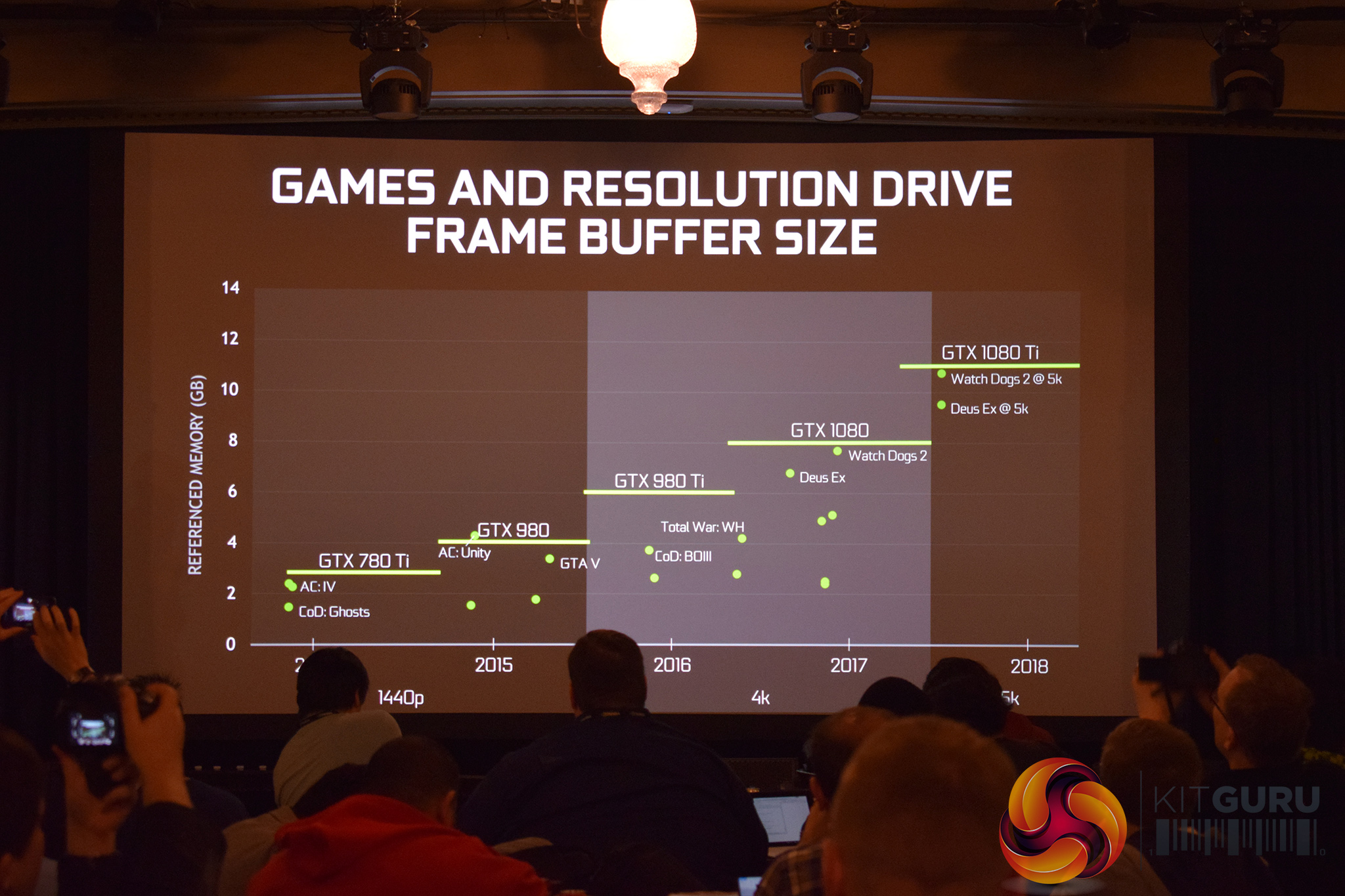 In terms of VRAM capacity, the 1080 Ti features 11GB of memory. It may be a strange number, but it makes sense as the 1080 Ti uses the same GP102 chip as the Titan X but with a single memory controller disabled. Nvidia were keen to emphasise that more and more games are now using more and more VRAM, though, so the added capacity over the GTX 1080 should offer tangible benefits.