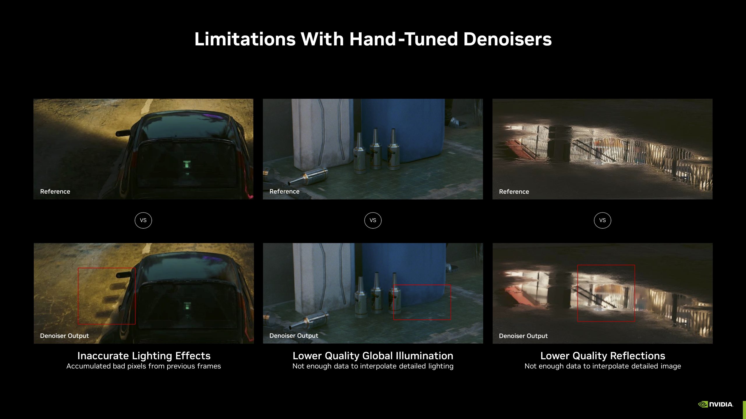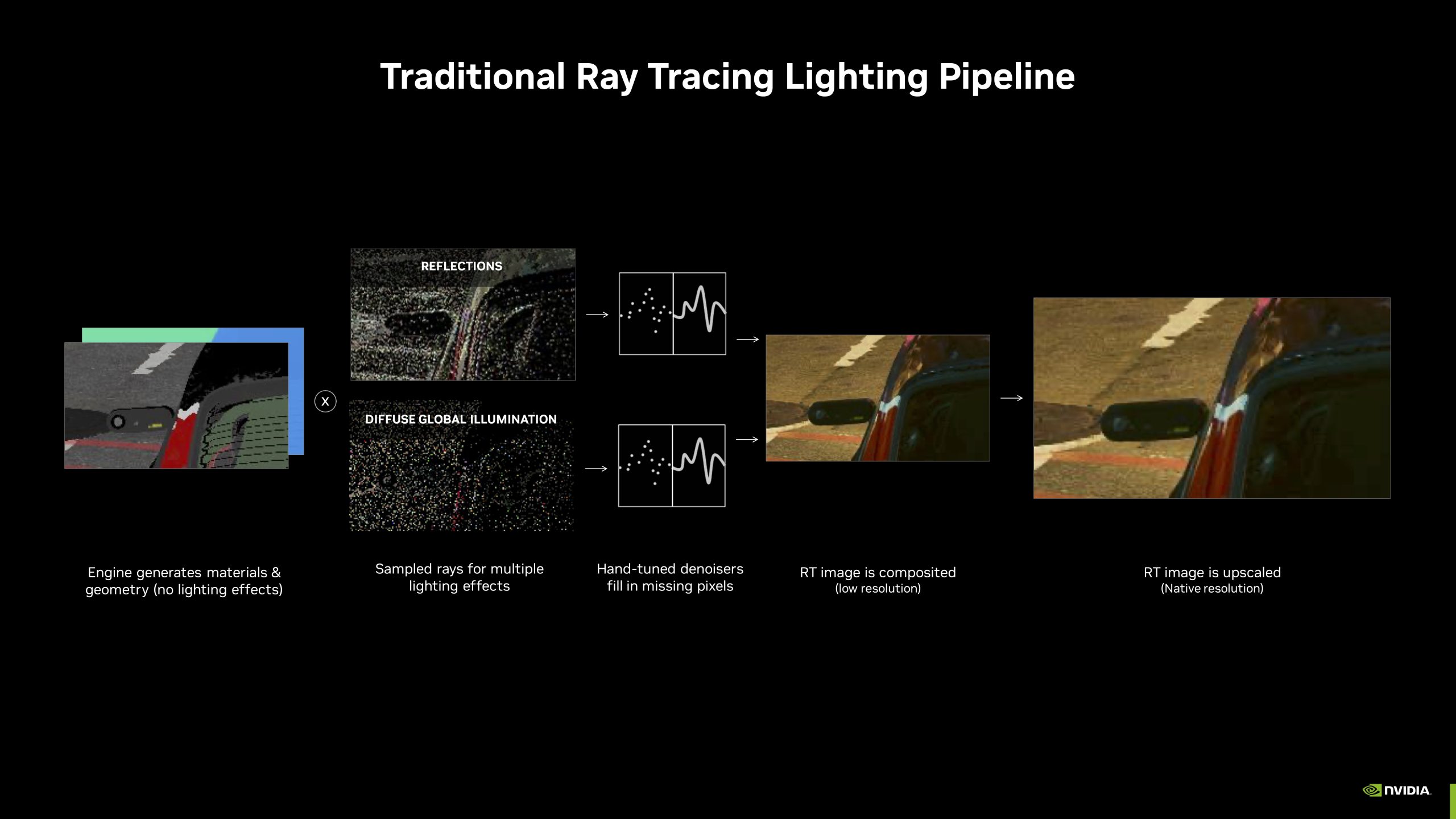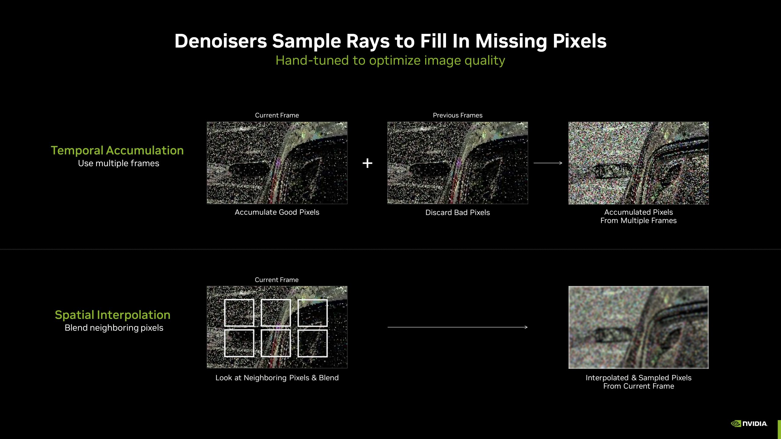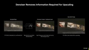 All ray traced games currently utilise one form of denoising or another, but Nvidia is keen to point out the current limitations – temporal accumulation denoisers can introduce ghosting, while spatial interpolation denoisers can reduce detail. No matter how you slice it, current so-called hand-tuned denoisers do reduce ray traced image quality in one form or another.