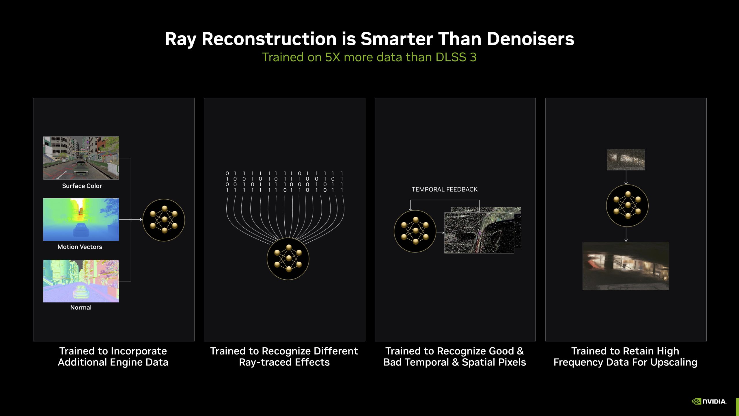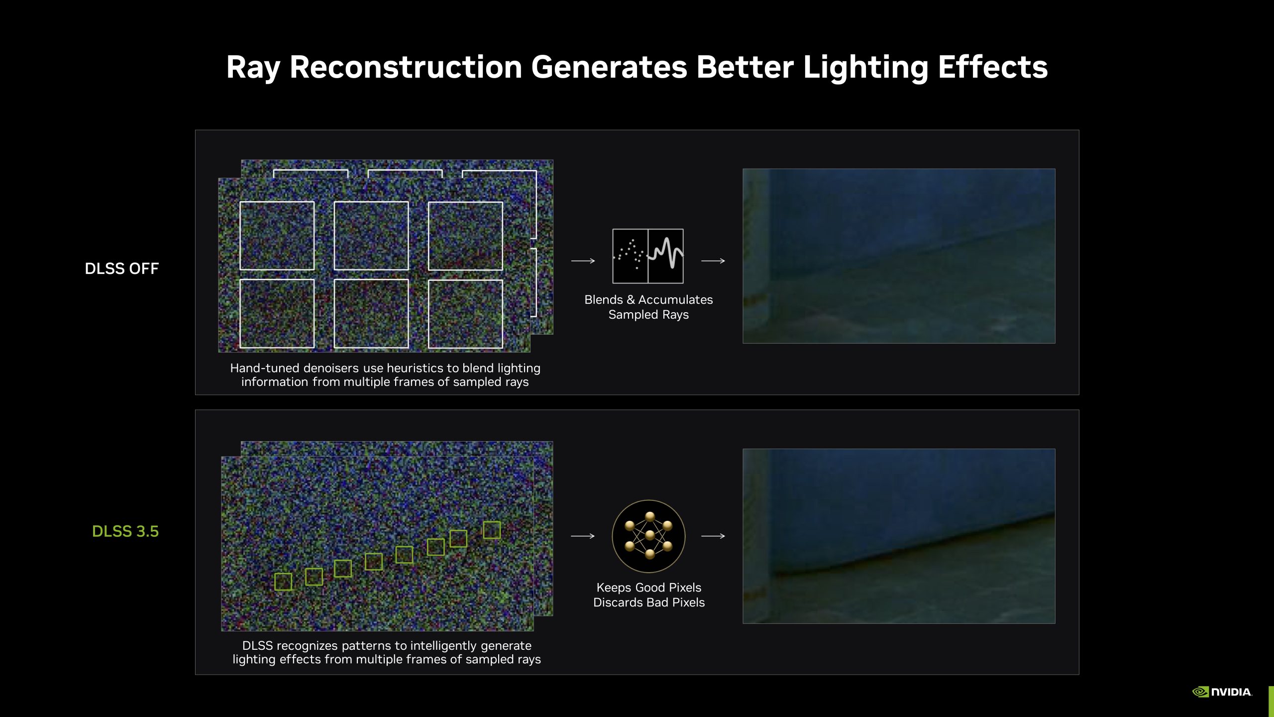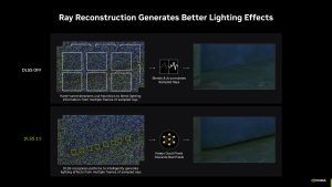 DLSS 3.5 was announced only recently at Gamescom 2023, bringing a new feature to the DLSS family – Ray Reconstruction. Unlike other DLSS features, including Super Resolution or Frame Generation, the goal behind Ray Reconstruction isn’t to boost your frame rate by lowering the internal resolution or adding in new frames. Rather, it is designed to significantly boost image quality when playing ray traced games, and it does this by replacing the denoising stage of the render pipeline.