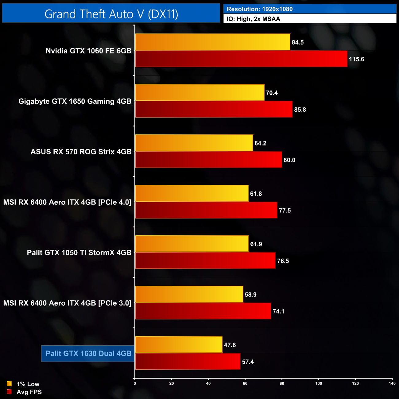 Bringing back the ever popular GTA V for this review, the GTX 1630 falls just shy of 60FPS on average when using High settings. It is still considerably slower than the other GPUs we’ve tested, but you can get a playable experience.