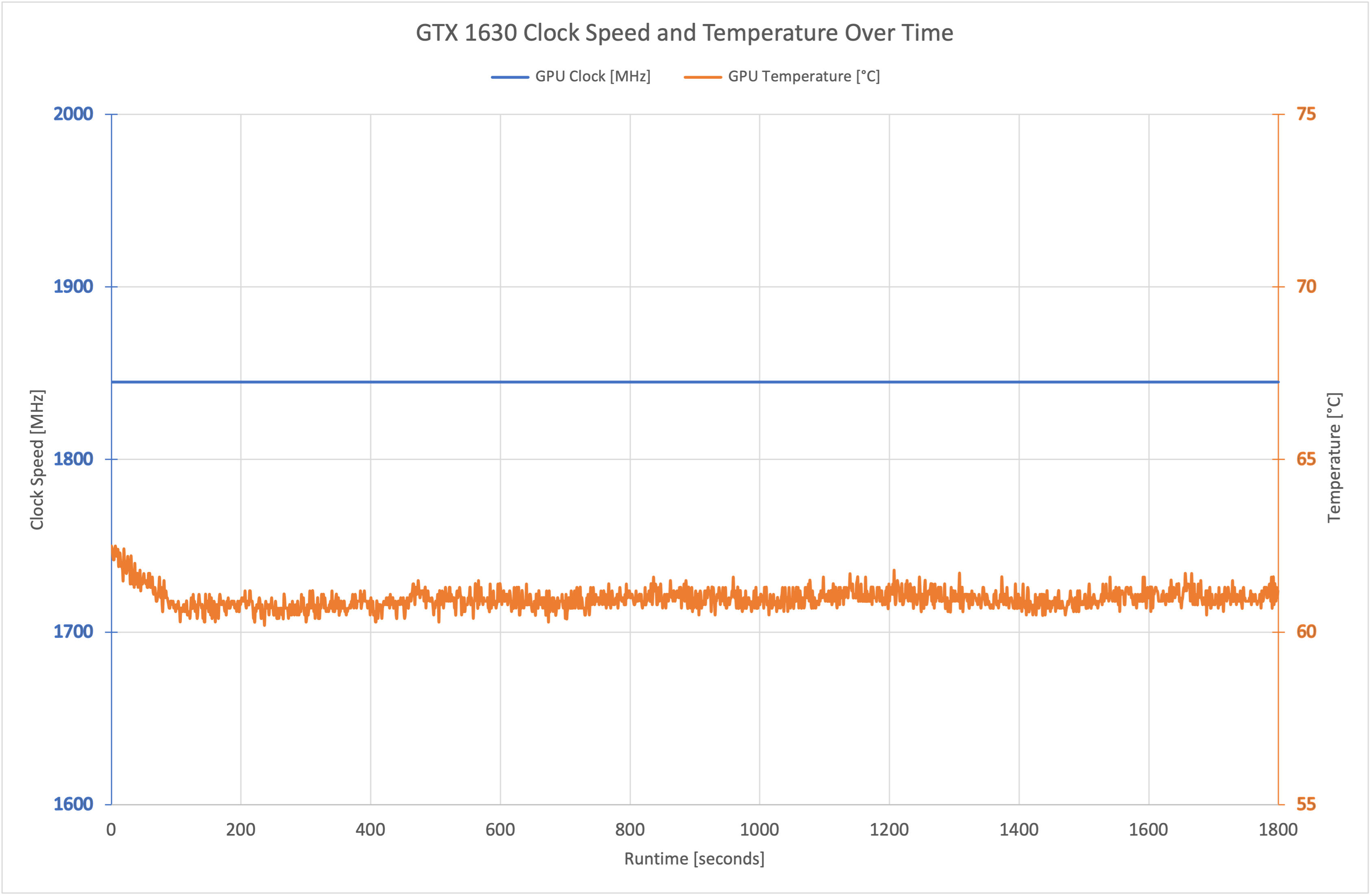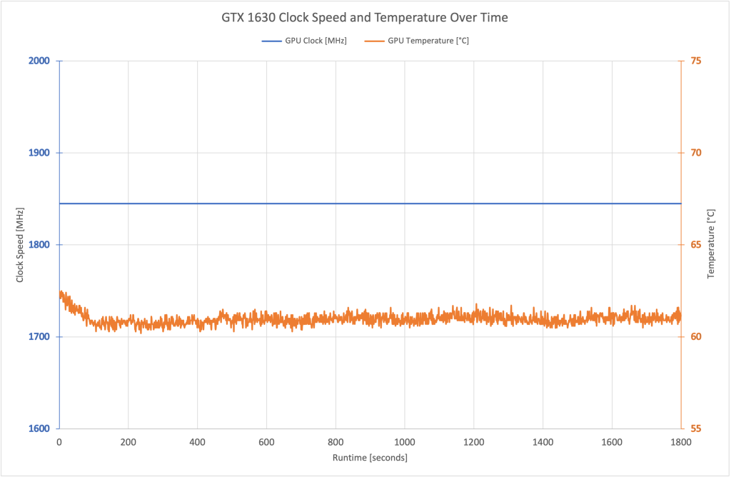The GTX 1630 ran at a locked 1845MHz over our testing – as you can see from the flat blue line above, it did not budge from this figure at all.