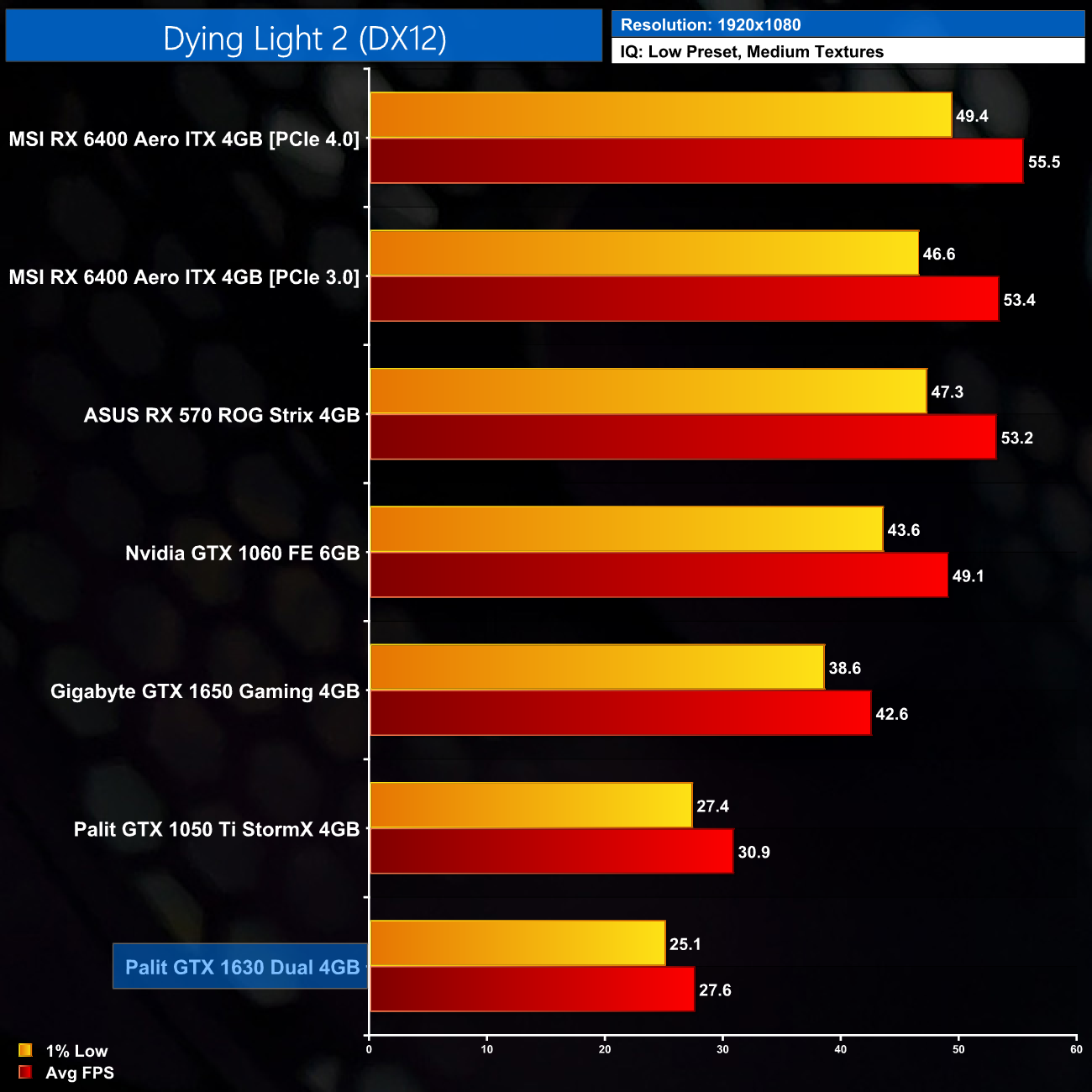 It’s a similar story in Dying Light 2. Again, using the Low preset but with medium textures is just too heavy for this calibre of GPU, and we see just below 28FPS on average. That puts it 35% behind the GTX 1650, while the RX 6400 actually does even better here, hitting over 50FPS.