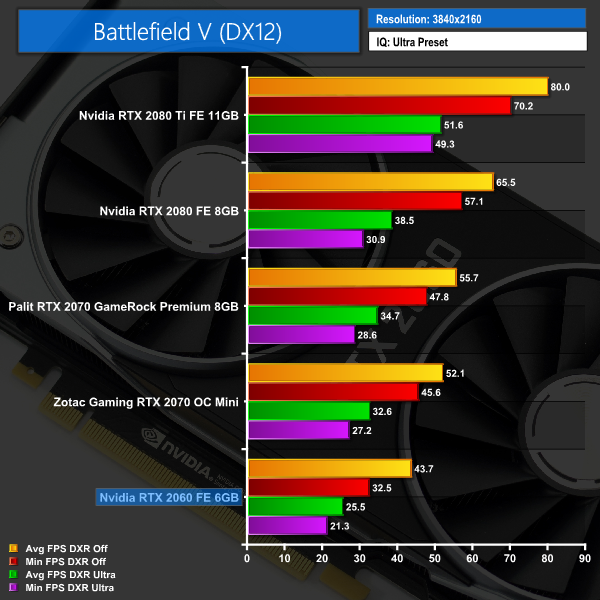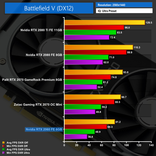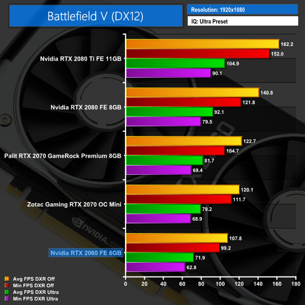 We test using the Ultra preset with the DX12 API. Battlefield V is the first game released with Nvidia RTX ray tracing features (called DXR in game) and we present average and minimum frame rates for the game with DXR Off, and then again with DXR set to Ultra.