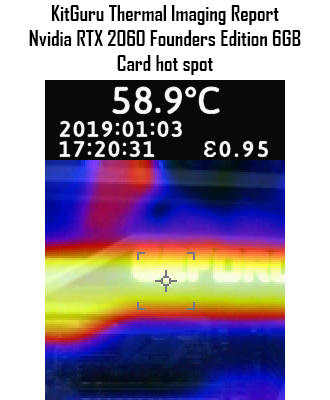 The hottest point we could detect using our thermal gun is also impressively cool – a peak of just 58.9C really is a top result, and that came from the side of the card just below the ‘GeForce RTX' logo.