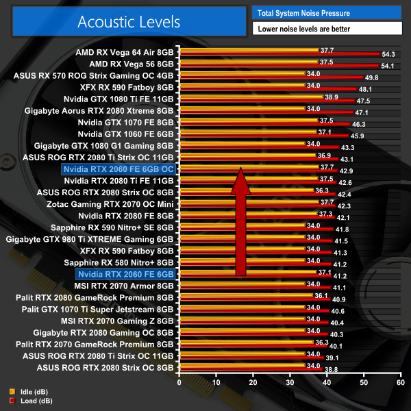 The 2060 Founders was able to cope with the extra frequency (and heat) very well. The GPU temperature rose 4C, which is still only a peak of 72C, and noise emissions peaked at just under 43dB – still a very good result for an overclocked Founders card, and still quieter than a stock-clocked GTX 1060 Founders Edition.