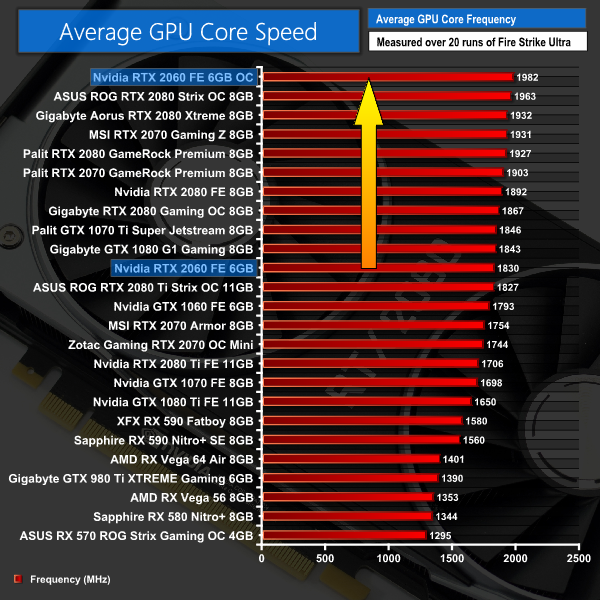 In terms of power, we saw the card draw almost 30W more, bringing the total power draw to 190.1W – so only marginally more than a reference clocked RTX 2070 card. The last metric to look at is average frequency, and here the card fell just short of the magic 2GHz figure, but an average clock speed of 1982MHz is still very impressive for a Founders card.