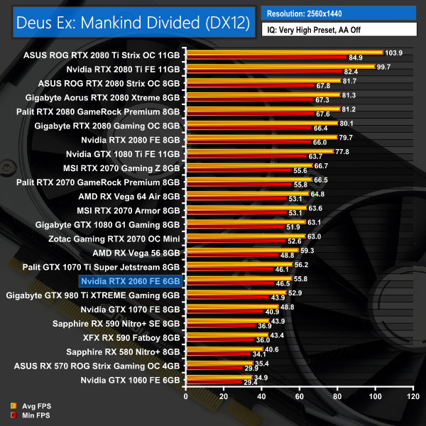 Our first game of the day, Deus Ex: Mankind Divided has the RTX 2060 behind the GTX 1070 Ti at both 1080p and 1440p, though it edges fractionally ahead – we are talking 0.1FPS – when the resolution is bumped up to 4K.