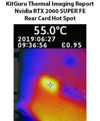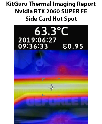 Our thermal imaging camera shows similarly impressive results, with a peak temperature of 63.3C on the card itself. The backplate is also doing a good job at spreading the heat produced from the rear of the PCB, with a 55C hotspot just to the side of the RTX logo.