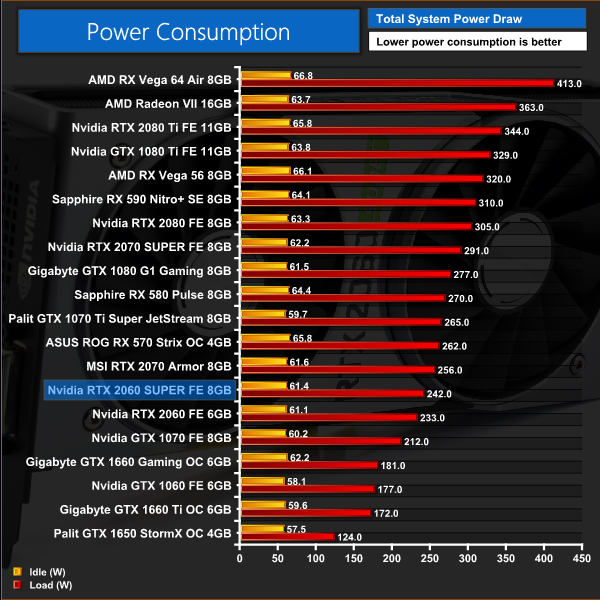 As expected, the 2060 SUPER sits directly in between RTX 2060 and RTX 2070 in terms of power draw. Our system pulled 9W more with 2060 SUPER than with the 2060 installed, and 14W less than with the 2070 installed. This is means the 2060 SUPER is pulling 41% less power than Vega 64, despite being the faster card on average. The upcoming AMD RX 5700 and 5700 XT cards certainly have their work cut-out when it comes to power efficiency.