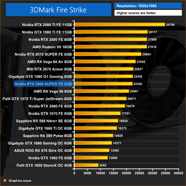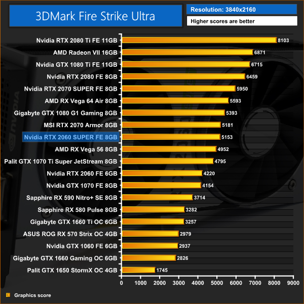 It's a strong start for the RTX 2060 SUPER in these 3DMark tests – it comes very close to the scores of MSI's RTX 2070 Armor, which is itself a reference-clocked 2070. In Fire Strike Ultra, for instance, the 2060 SUPER is not even 30 points behind the 2070.