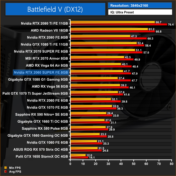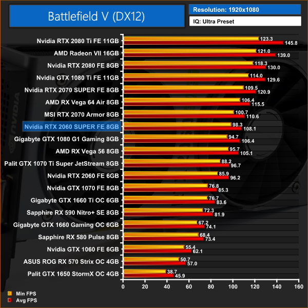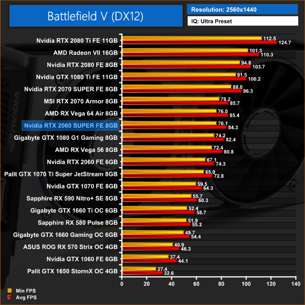 Battlefield V is our first game of the day, and here we can observe a similar trend that we saw during the 3DMark tests – that 2060 SUPER performs very close to the RTX 2070. It's just a 2.5FPS difference at 1080p, while at 1440p this shrinks to 1.4FPS. There's not a lot in it at all.