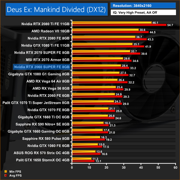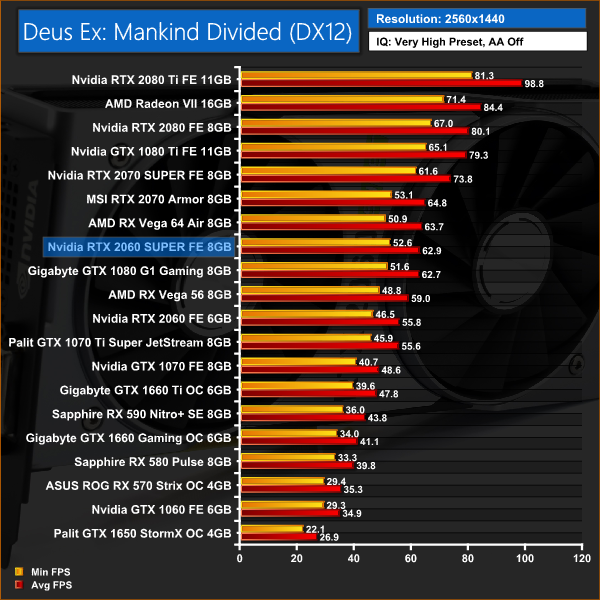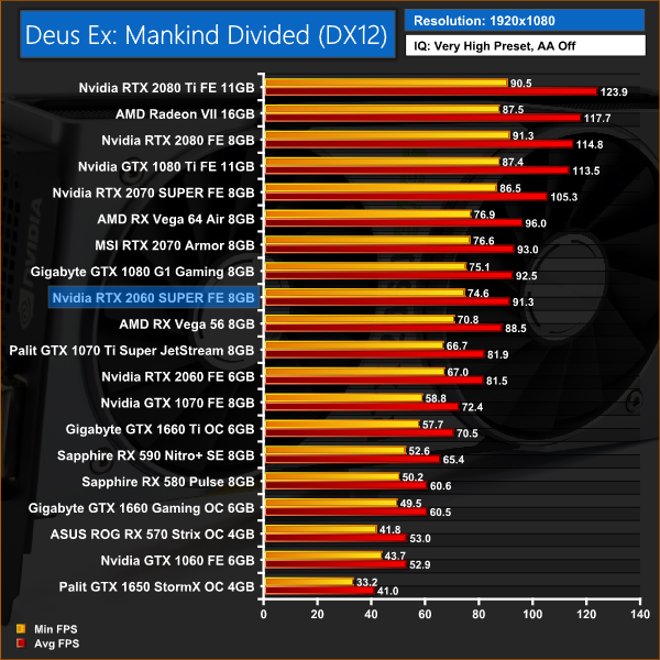 It's more of the same when testing Deus Ex: Mankind Divided, with RTX 2060 SUPER never more than two frames slower than the RTX 2070. It also edges ahead of GTX 1080 and 1440p and 4K resolutions.