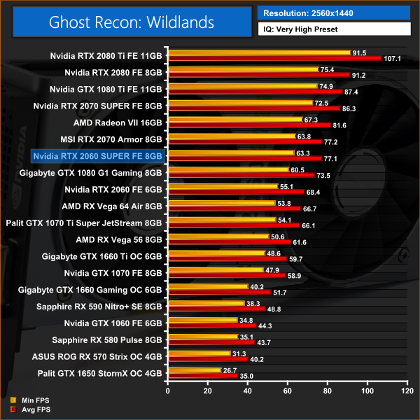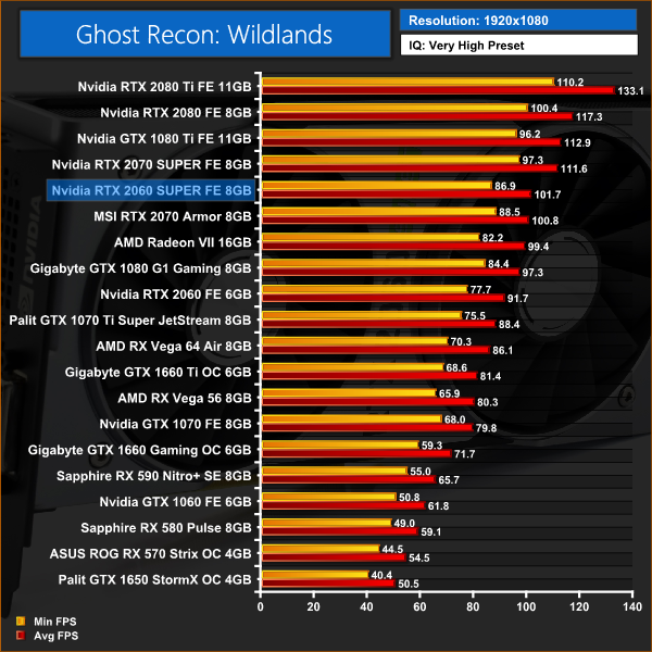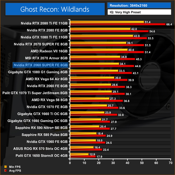 We had an interesting result at 1080p when playing Ghost Recon: Wildlands – 2060 SUPER was just beating the RTX 2070. It wasn't by much at all – not even a full frame – but it was just faster at this resolution. The 2070 retook the lead at 1440p and 4K resolutions, however, but clearly there is not much between these two cards at all.