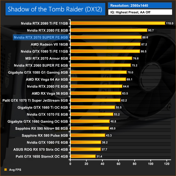 Shadow of the Tomb Raider picks up where Shadow of War left off, as the 2070 SUPER is again faster than a 1080 Ti across all three resolutions tested. It is also faster than Radeon VII at 1080p and 1440p, but the AMD card comes back at 4K to regain the lead.