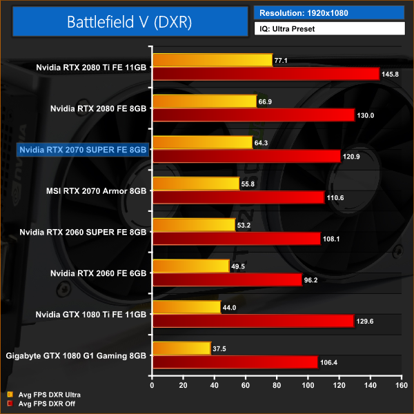 Battlefield V, with its ray traced reflections, hits frame rates hard – the 2070 SUPER averaged 64FPS with DXR Ultra, versus 120FPS with DXR off. You can still play with DXR on at 1080p and 1440p with this card, but performance isn't even close to what you get with DXR off.