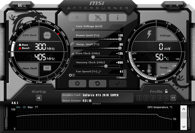 We used MSI Afterburner to overclock the 2070 SUPER. Our best result came with +135MHz to the GPU core, and +900MHz to the memory. I did have +150MHz stable on the GPU core, but Time Spy showed noticeable artificating so I pulled things back slightly.
