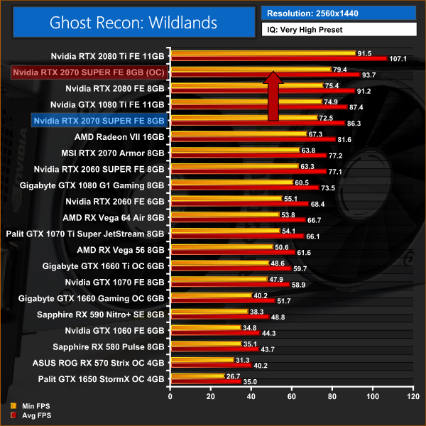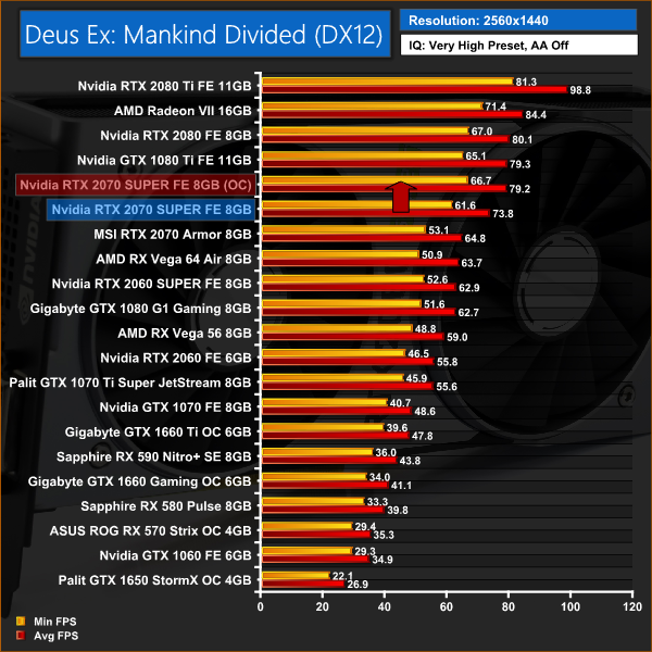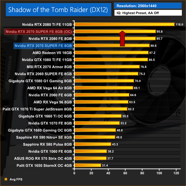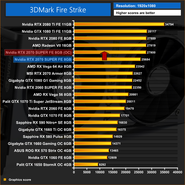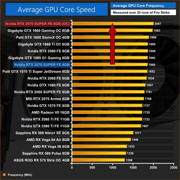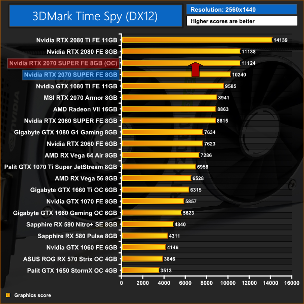 This brought decent gains in our 1440p game testing – our overclocked 2070 SUPER was now effectively matching, and in some case beating, the RTX 2080 for performance. Our Fire Strike score also improved by over 2000 points, so overall a very decent overclock.