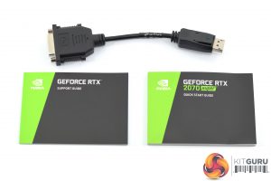 Inside, we find a support guide and a quick start guide, alongside a DisplayPort to DVI-D adapter.