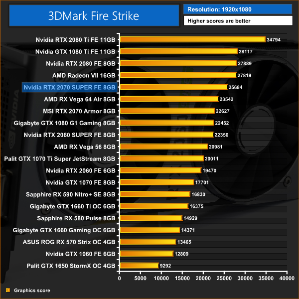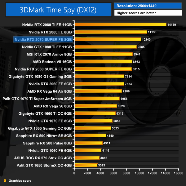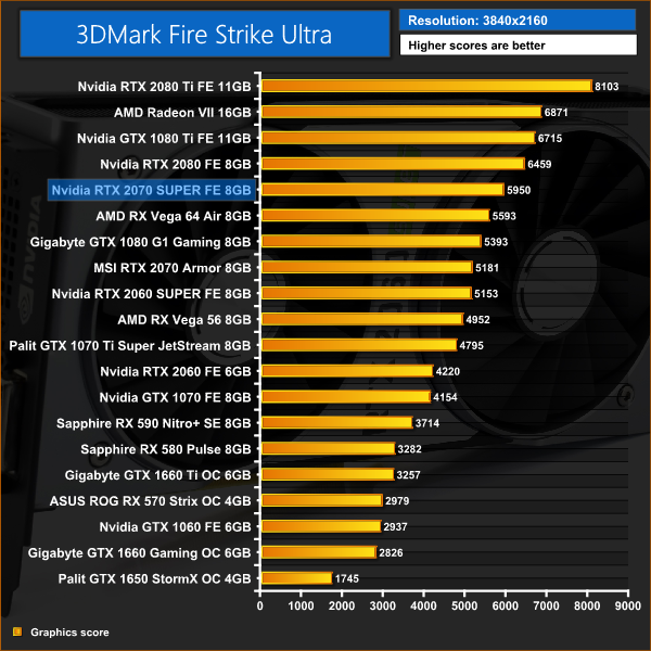 Our initial 3DMark findings are as expected – the RTX 2070 SUPER slots neatly in between the 2070 and 2080 across all three benchmarks. It does better in the DX12 Time Spy test, however, where it beats the GTX 1080 Ti, but that Pascal card scores higher in the Fire Strike and Fire Strike Ultra benchmarks.