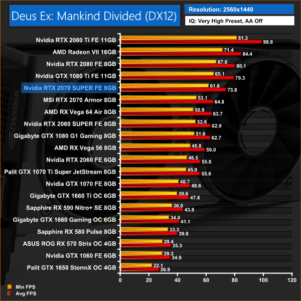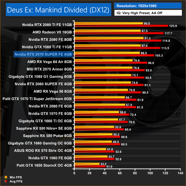 It's more of the same in Deus Ex: Mankind Divided. GTX 1080 Ti pips RTX 2070 SUPER to the post once more, but this SUPER card is noticeably faster than regular RTX 2070.
