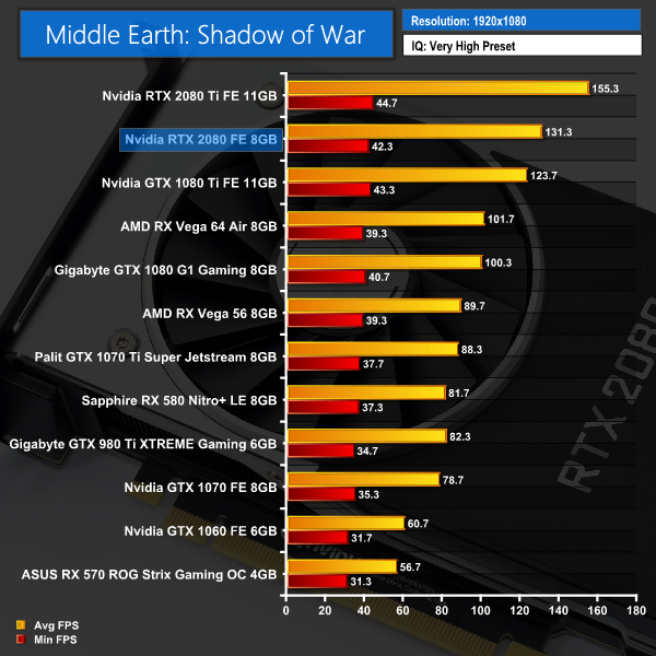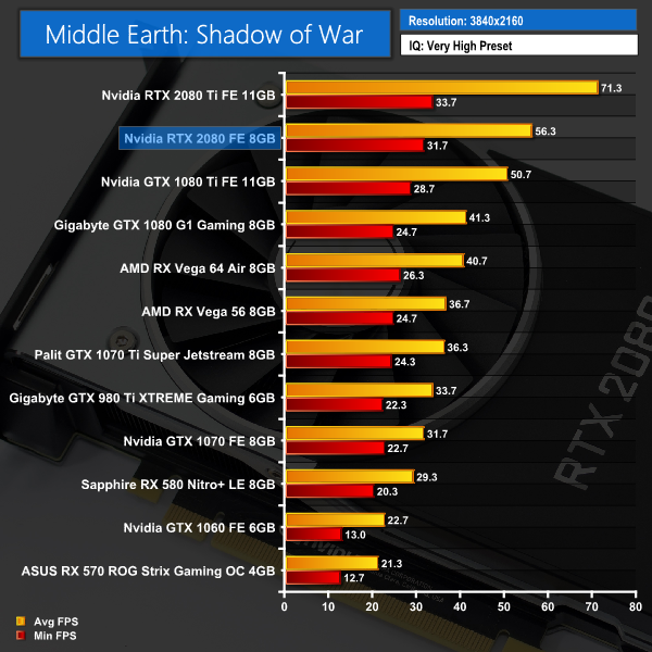 Middle Earth: Shadow of War shows the biggest lead for RTX 2080 over GTX 1080 Ti so far – the gap is 5.6FPS, even at 4K, while at 1440p the difference is 8.1 FPS.
