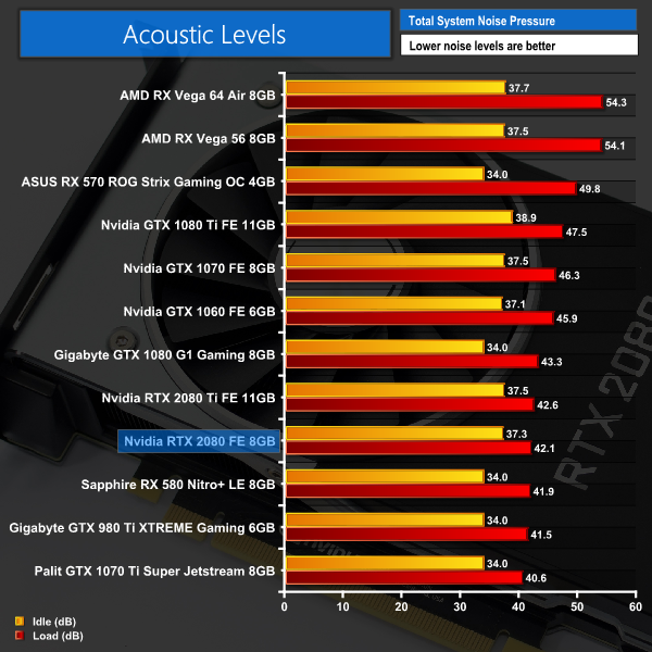 Following on from the impressive temperature testing, how about the noise emissions of the Founders Edition RTX 2080! It's the quietest reference card we've ever tested, coming in even quieter than the triple-fan Gigabyte G1 Gaming GTX 1080 as well – an aftermarket card. Nvidia's decision to ditch the blower-style fan in favour of the dual axial fan setup has clearly reaped dividends – the typecast of reference cards as being noisy is certainly over.