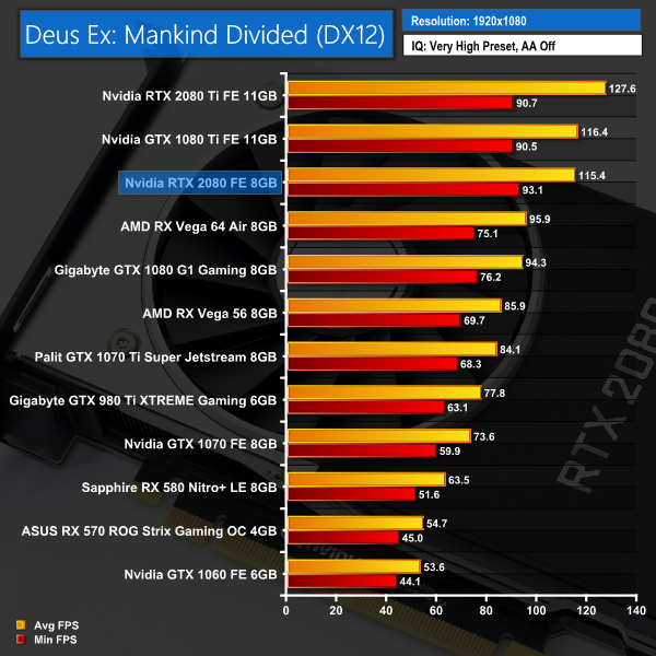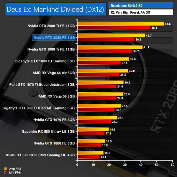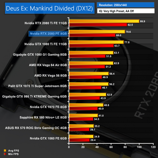 There's very little in it while playing Deus Ex: Mankind Divided. The GTX 1080 Ti takes a 1FPS lead at 1080p, before dropping back at 1440p. The gap at 2160p (4K) is 1.6FPS.