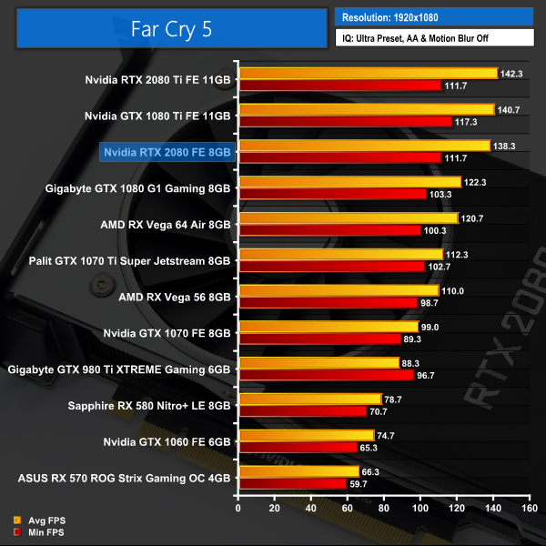 We can see clear signs of bottlenecking at 1080p when testing Far Cry 5 – the GTX 1080 Ti, RTX 2080 and RTX 2080 Ti all average well over 100FPS, yet they perform within just 4FPS of each other. The performance drop when going up to 1440p is also less than expected, which just goes to show – even with a hexacore i7-8700K, overclocked to 4.8GHz, you can still run into bottlenecking if you use one of the fastest cards on the market.