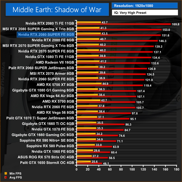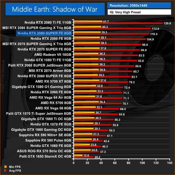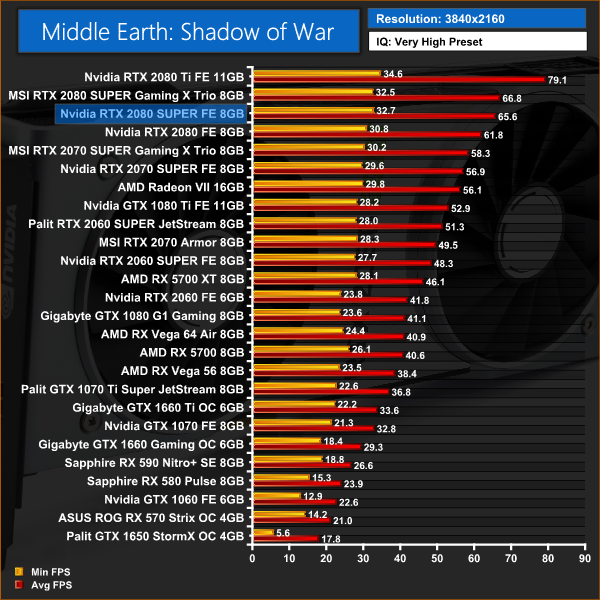 Performance is pretty consistent throughout our Shadow of War testing, with the 2080 SUPER ahead of its little brother by 5%.