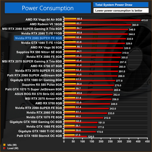 RTX 2080 SUPER total graphics power is rated at 25W higher than the original 2080, and that played out pretty well in our testing, with our system drawing an extra 29W with the 2080 SUPER. That's only 10W less than the 2080 Ti, however, so it is not as impressive in terms of overall power efficiency.