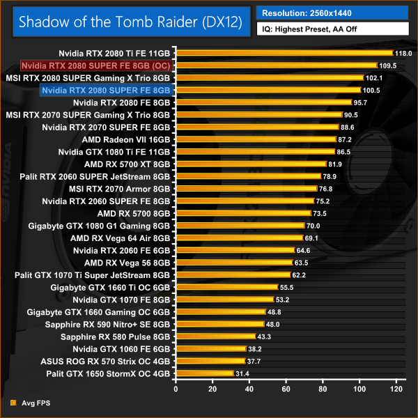 This overclock definitely brought some very solid gains when gaming at 1440p, with our frame rates improving by up to 10FPS. Total performance increased by 9% on average.