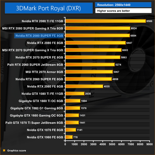 In the ray tracing-specific Port Royal benchmark, the 2080 SUPER scores about 400 points more than the RTX 2080, though the 2080 Ti is still 1600-odd points ahead.