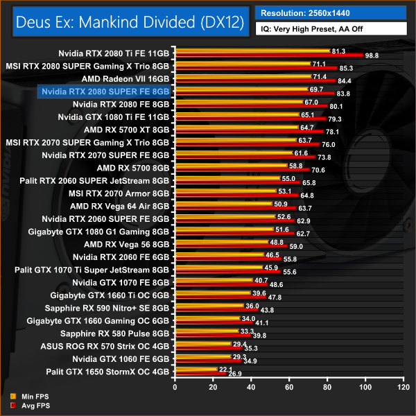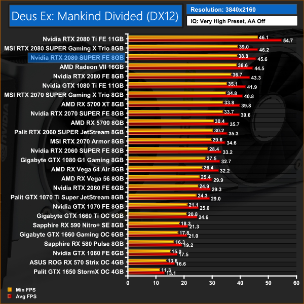 In Deus Ex: Mankind Divided we see an average performance increase of 4% for the 2080 SUPER over the 2080. It's enough to take it past the Radeon VII at 4K.