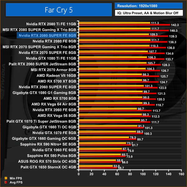 Things are more congested when playing Far Cry 5 at 1080p, with a pretty obvious CPU bottleneck affecting the results. Again at 4K, however, we see the 2080 SUPER outperforming the 2080 by around 4%.