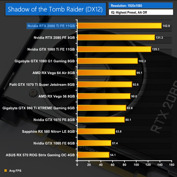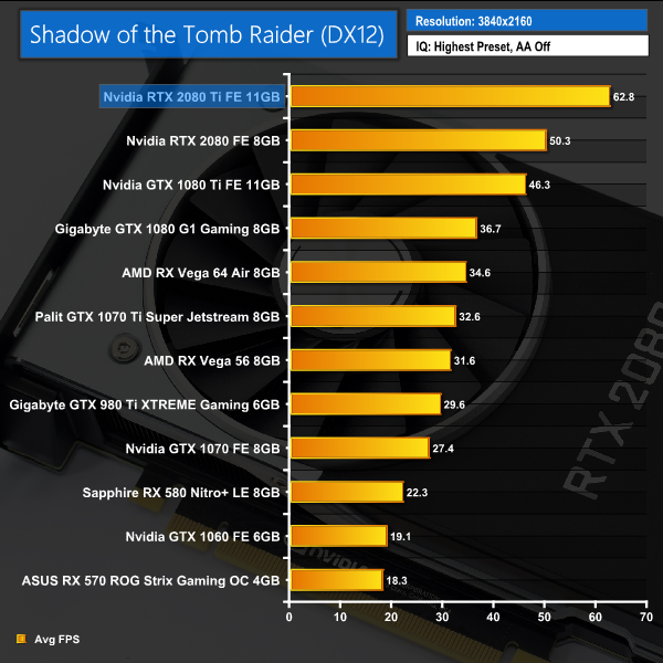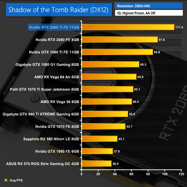 Our newest game to join the roster, Shadow of the Tomb Raider shows an average of 62FPS at 4K resolution, with the average increasing to over 110FPS at 1440p. Both results are significantly faster than the GTX 1080 Ti frame rates.