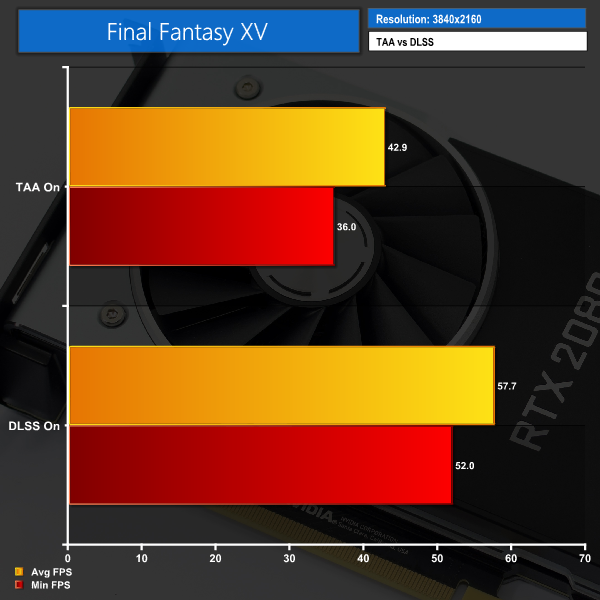 Nvidia supplied another demo for the purposes of this review – this time from Final Fantasy XV. We were able to run the demo at 4K with both TAA and DLSS anti aliasing solutions. We used FRAPS to extract minimum and average FPS figures, after a 1-minute run.