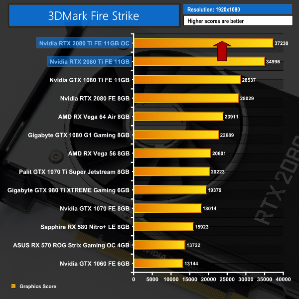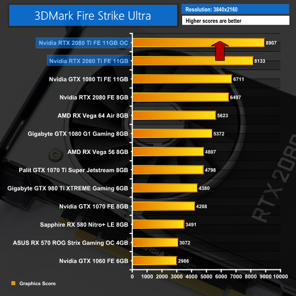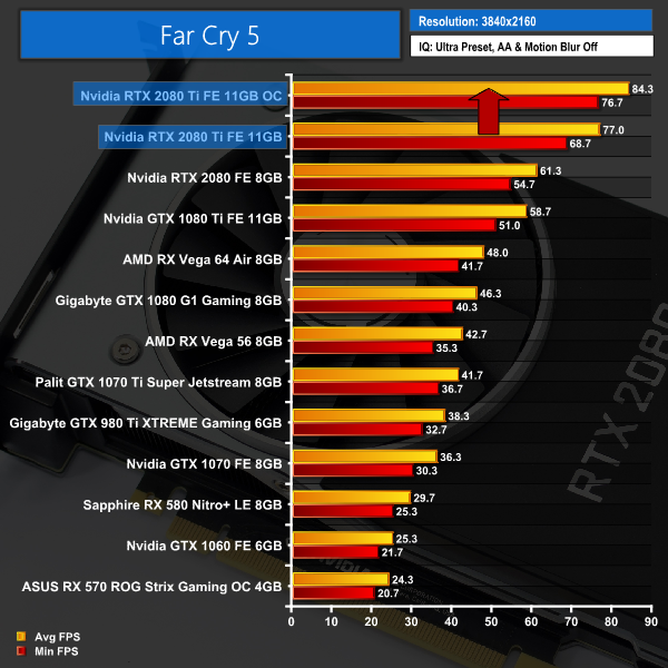 This overclock had a big effect on the performance of the RTX 2080 Ti – the Fire Strike score jumped over 2000 points (+6.4%) while we also gained an extra 7.3FPS on average when playing Far Cry 5 at 4K.