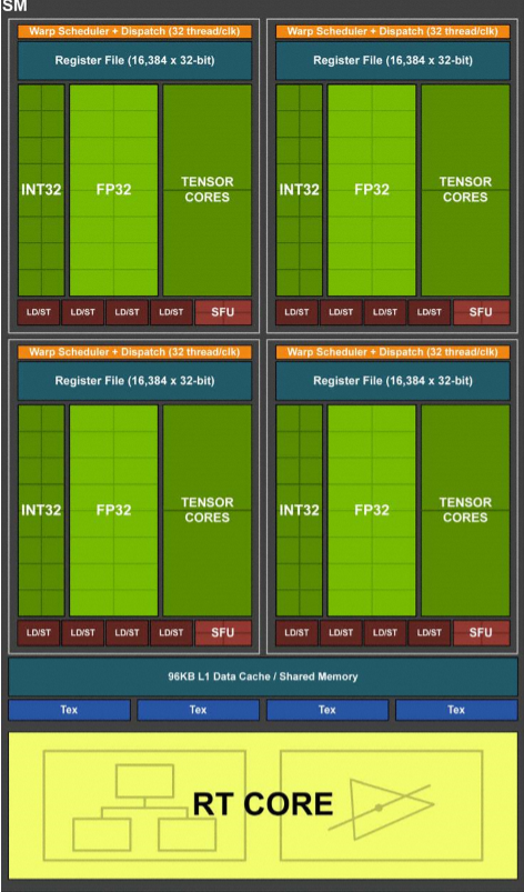 Compared to Pascal, the Turing SM sports quite a different design that builds on what we first saw with the Volta GV100 GPU. On the surface level, Turing includes two SMs per Texture Processing Cluster (TPC), with each SM housing 64 FP32 cores and 64 INT32 cores. On top of that, a Turing SM also includes 8 Tensor Cores and one RT core.
