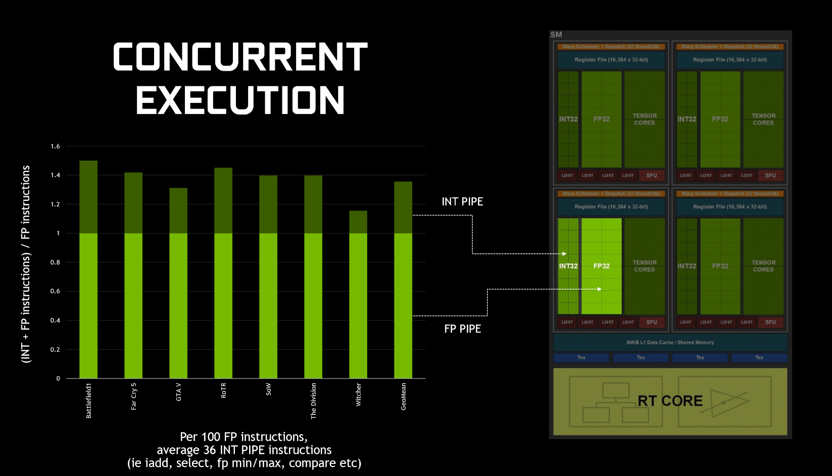 What makes Turing significant for today's games, is how it executes datapaths. That's because, in game, GPUs typically execute both floating point (FP) arithmetic instructions, as well as simpler integer instructions. To demonstrate this, Nvidia claims that we ‘see about 36 additional integer pipe instructions for every 100 floating point instructions', although this figure will vary depending on what application/game you run.