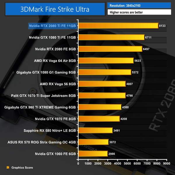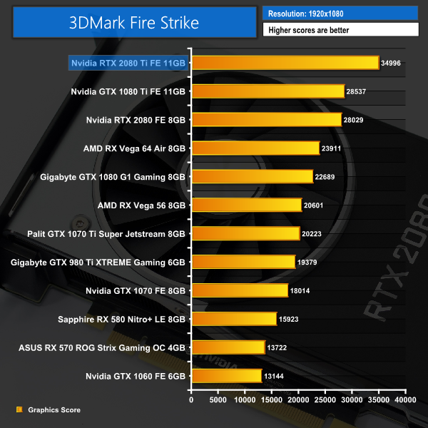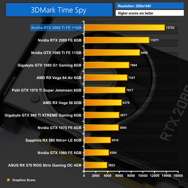 Well well well. How about that for a start – the RTX 2080 Ti kicks things off by coming in 22% than a GTX 1080 Ti in Fire Strike, while it ups this lead to a whopping 44% in the DX12 Time Spy test.