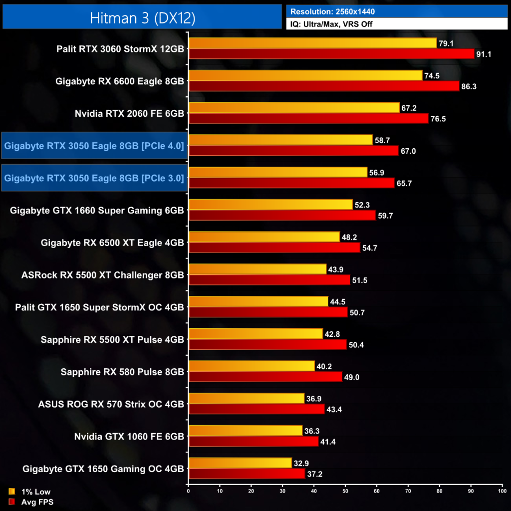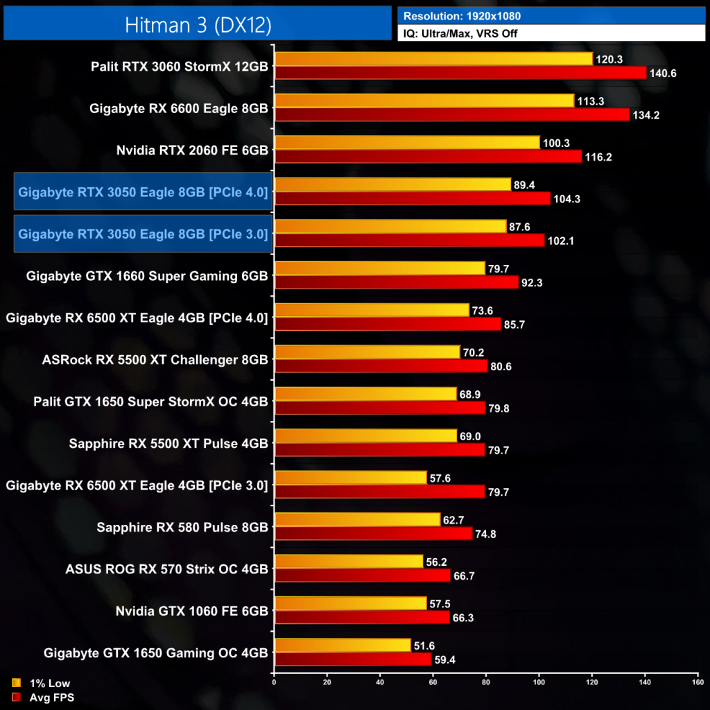 Hitman 3, meanwhile, sees the RTX 3050 comfortably beating the GTX 1660 Super, this time by a 13% margin which is the biggest difference we will see today. Compared to the RTX 2060, it's performing 10% slower on average, though PCIe bandwidth makes basically no difference in this game.
