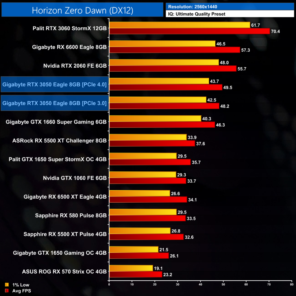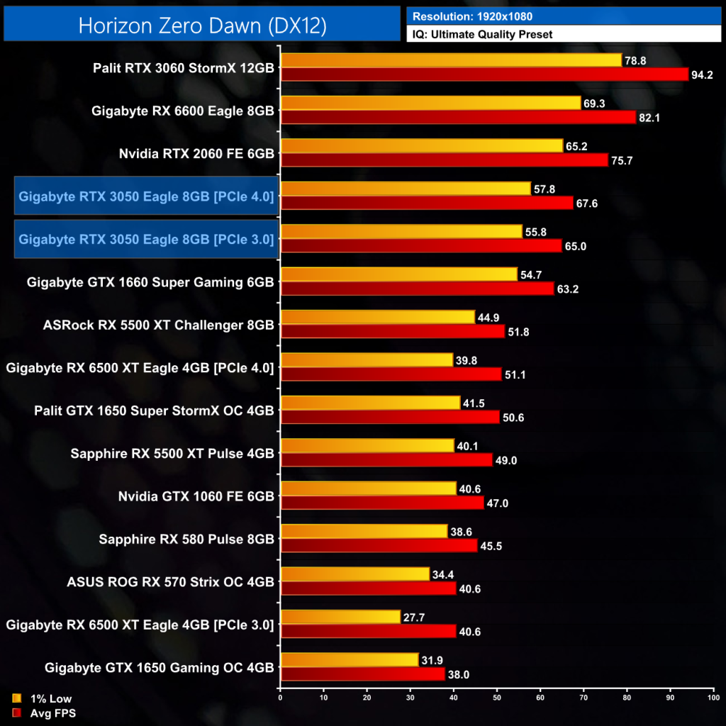 Up next is Horizon Zero Dawn, where we’re looking at an average frame rate almost hitting 70 FPS for the RTX 3050. That still puts it closer to the GTX 1660 Super than it does to the RTX 2060, but performance is decent enough. PCIe bandwidth doesn’t make a big difference to the RTX 3050 here either, which was slightly surprising to me as I remember the drama about PCIe bandwidth when this game first came out, but it’s good news for prospective RTX 3050 buyers.