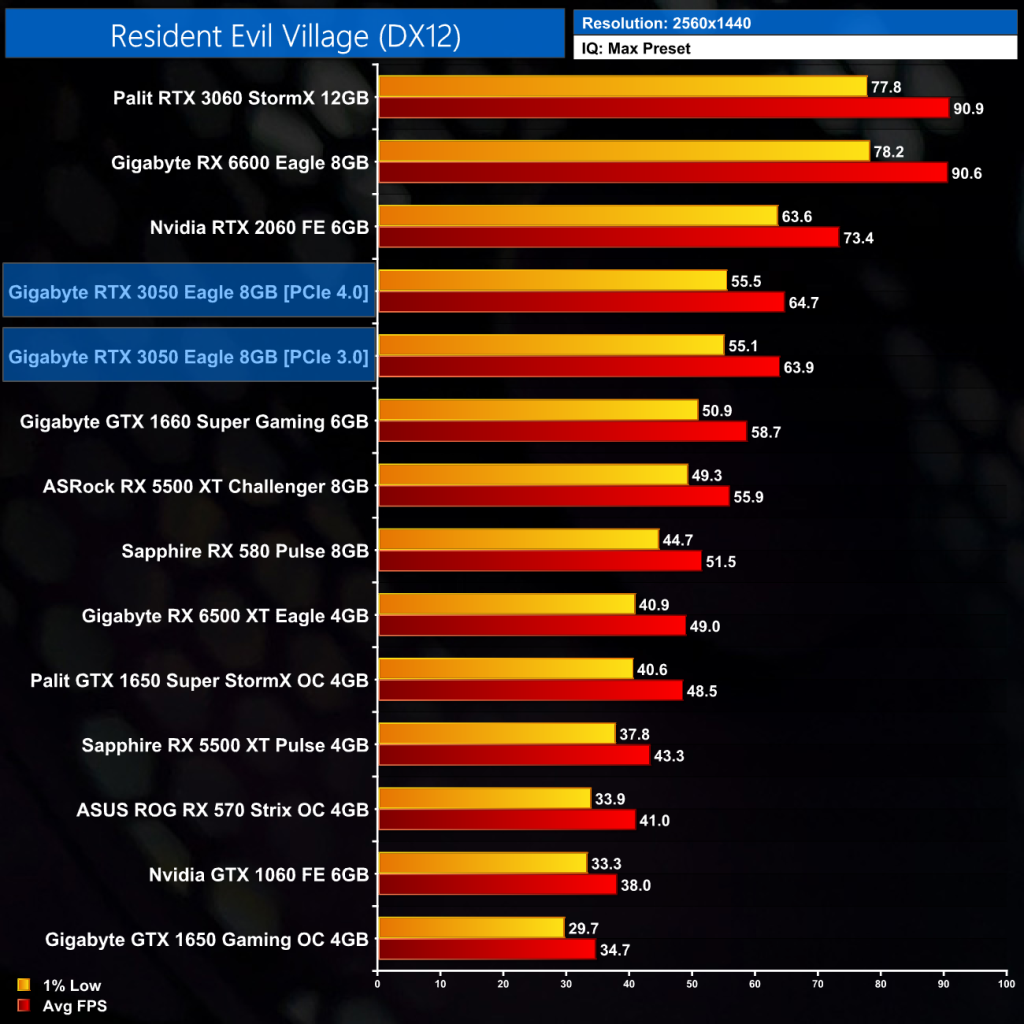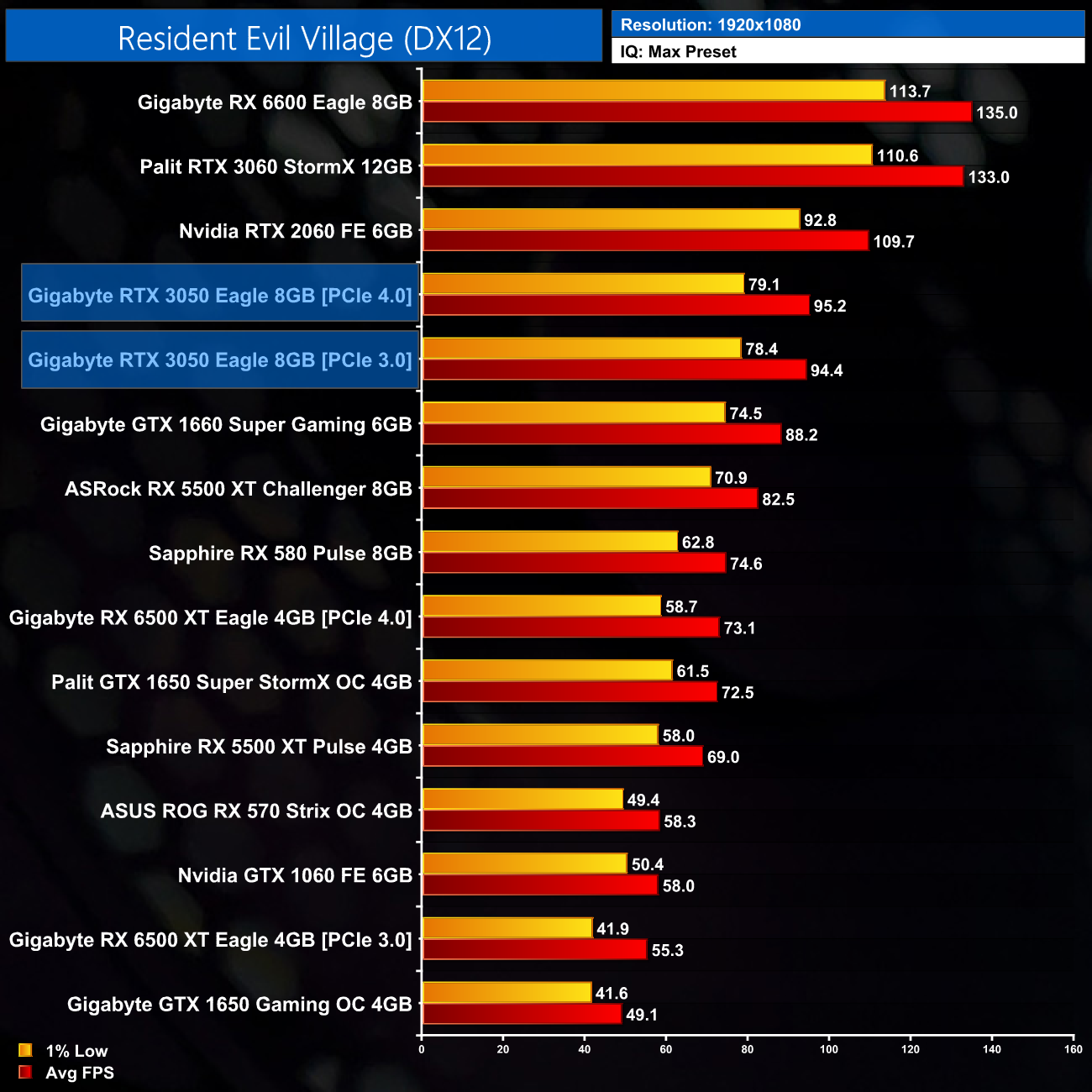 Moving onto Resident Evil Village, as expected from this game frame rates are very high indeed, and even at maximum settings we’re seeing over 90 FPS on average for the RTX 3050. That makes it 8% faster than the GTX 1660 Super, but still 13% slower than the RTX 2060.