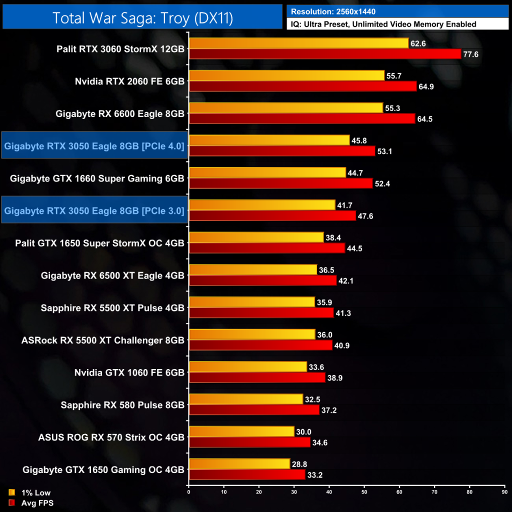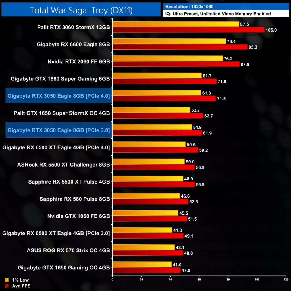 Meanwhile in Total War Saga: Troy, this is the game where we see the biggest hit to performance when testing the RTX 3050 with PCIe Gen3 speeds. It’s actually 13% slower here on PCIe 3.0 compared to PCIe 4.0, meaning the GTX 1650 Super is faster on PCIe Gen3. On PCIe 4.0, the RTX 3050 is on par with the GTX 1660 Super, averaging around 72 FPS.
