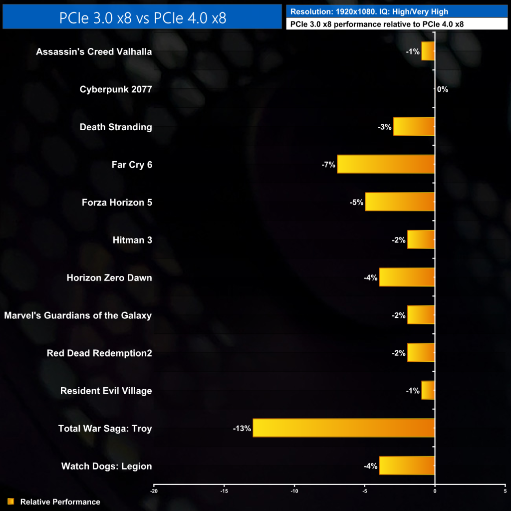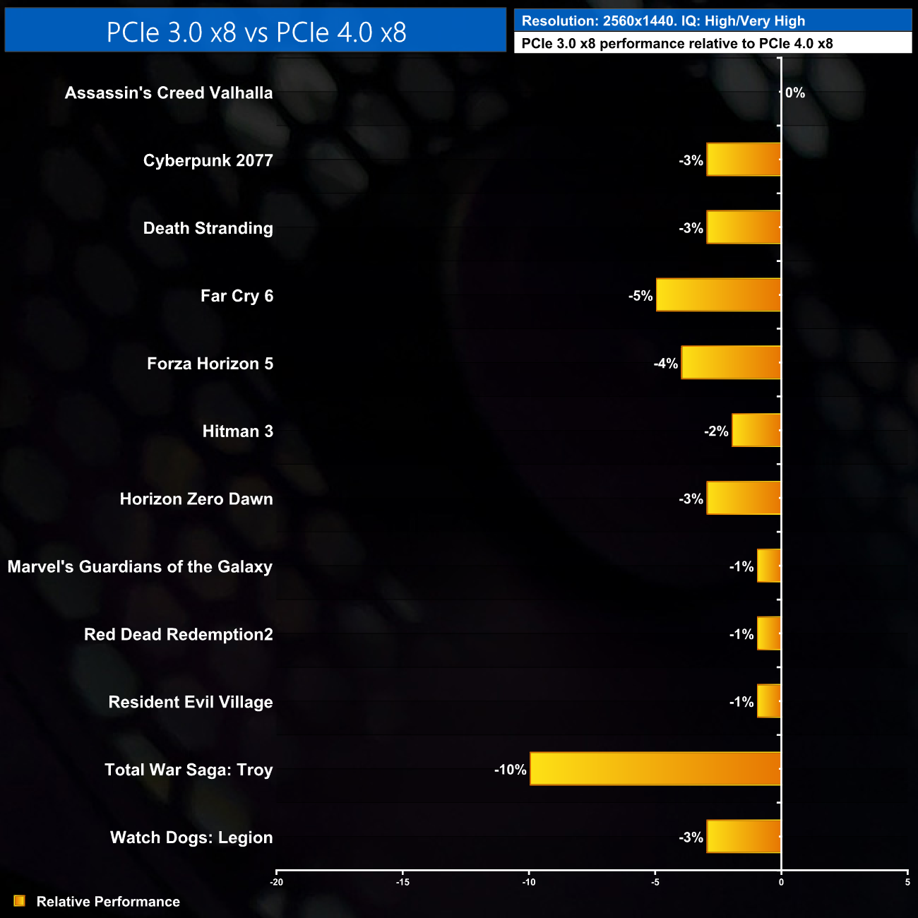 To illustrate the difference made by running the RTX 3050 on a PCIe 3.0 x8 interface, instead of PCIe 4.0 x8, below we can see a chart showing the RTX 3050's PCIe 3.0 performance, relative to its PCIe 4.0 performance.
