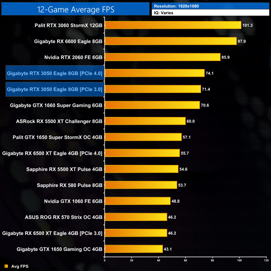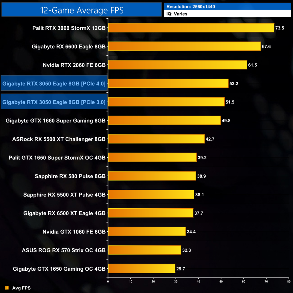 Looking at the big picture overview, after all of our game benchmarks it is not a surprise to see the RTX 3050 is 5% faster on average than the GTX 1660 Super, though that drops to basically nothing if testing the RTX 3050 on PCIe 3.0. Compared to the RTX 2060, the RTX 3050 comes in 14% slower on average, so it is a decent chunk behind the 2060. The RX 6600, meanwhile, is 32% faster, despite the MSRP only being 25% higher, but as we know MSRP doesn’t mean anything these days.