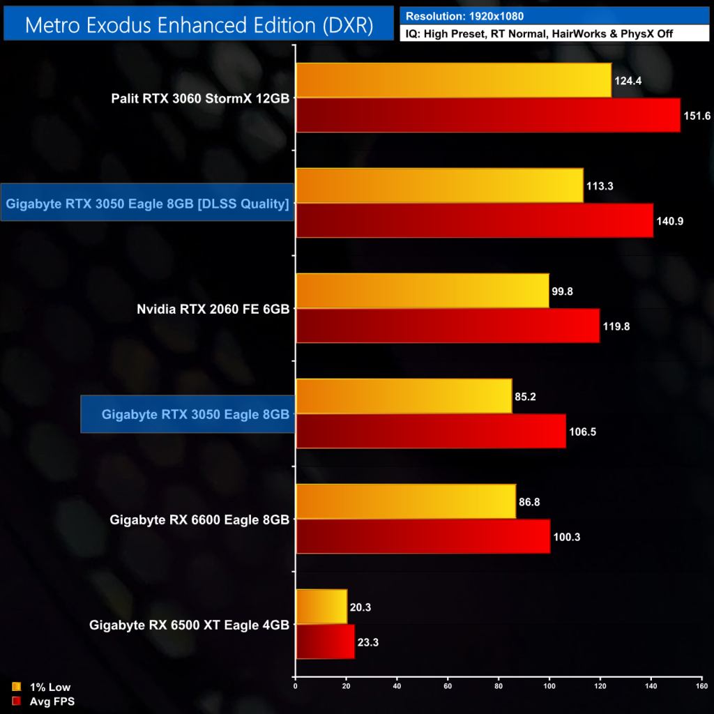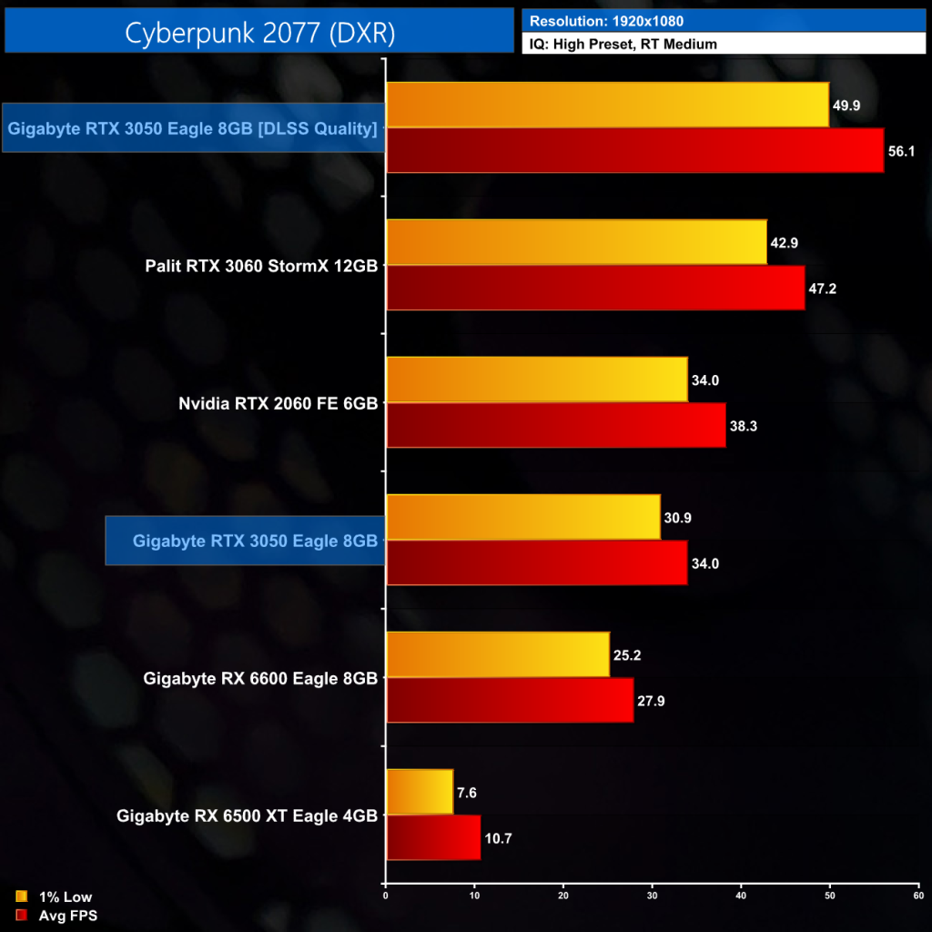 We will also touch on ray tracing – after all, the RTX 3050 is Nvidia’s first sub-£300 card to feature the technology. I’m not sure how many people will want to turn it on, but it can do a decent-enough job when using lower RT quality settings, as we can see in Cyberpunk and Metro Exodus Enhanced Edition, but turning on DLSS goes a long way to making things more playable.