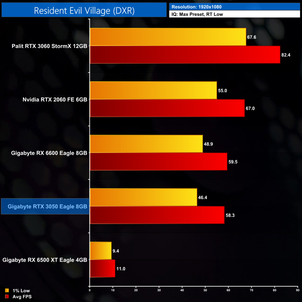 - Resident Evil Village: Ray traced reflections and shadows set to Low.